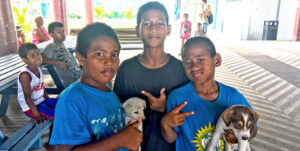 Two young boys bring their puppies to a MIAOW clinic in 2016.