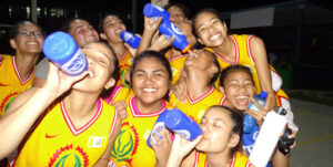 The Namdik basketball ladies show they are not only ‘mokade’ players, but they are environmentally friendly using multiple-use water bottles. This is an initiative by the Marshall Islands Basketball Federation to reduce plastic use. Team Namdik is competing in the 19th Ralik Ratak Shootout national basketball championships that are ongoing in Majuro now.