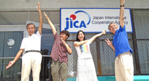 JICA volunteers, from left, outside the JICA office in Majuro: Morisako Tatsuo, Nagi Imamura, Sakura Uehara and Norihiko Kawasaki. Photo: Eve Burns.