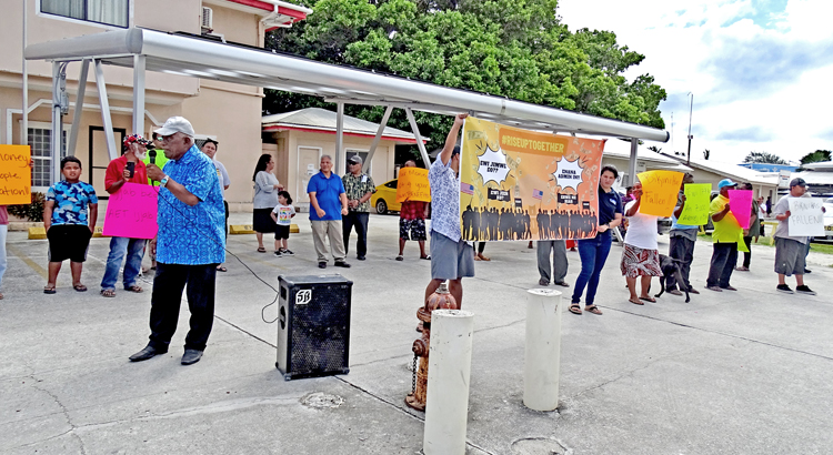 With Bikini elder Simon Jamore at the microphone, left, Bikini protestors carrying signs gathered in front of the KBE Town Hall on May 6 for a rare demonstration in Majuro.