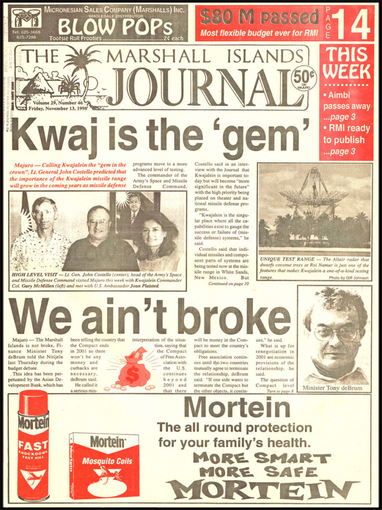 Jaluit Jaluit Senator Rien Morris fired a fastball at President Imata Kabua, but the president brushed off the brushback pitch as if it were nothing. The exchange took place Friday at the Nitijela. In reference to the investitation in Social Security, Morris asked if anyone — he specifically directed the pitch to the president — could confirm of deny if there are people living at the Outrigger Hotel who have had their accommodations paid for by the Social Security Administration but not under their real. Names? Is this true or false, he asked. The President responded by fouling off Morris’ delivery into the bullpen down the left field line. “The question is just to shoot me, and if I die, how can I answer the question?”