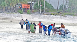 A visiting VIP delegation experienced the difficulty of getting from boat to land at Lib Island this past weekend to attend the Lib Island Local Government inauguration. Photo: Hilary Hosia.