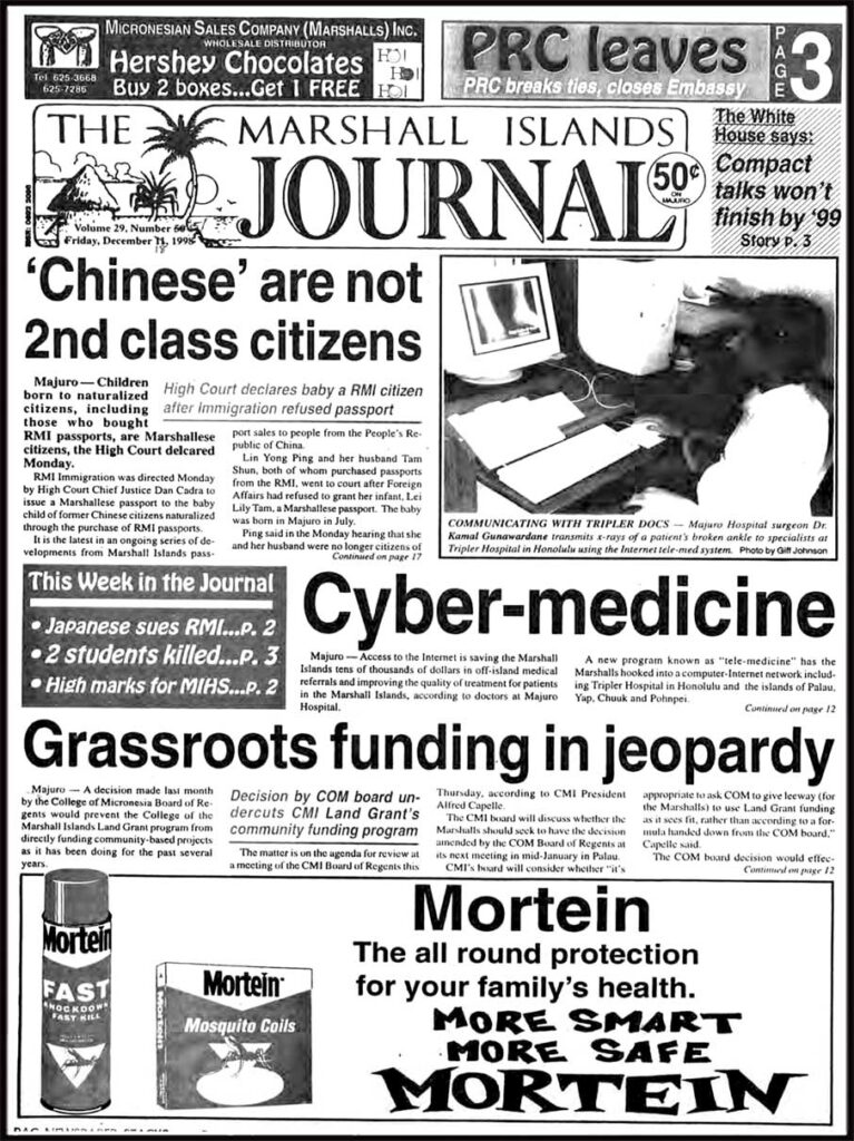 Children born to naturalized citizens, including those who bought RMI passports, are Marshallese citizens, the High Court declared Monday. RMI Immigration was directed Monday by High Court Chief Justice Dan Cadra to issue a Marshallese passport to the baby child of former Chinese citizens naturalized through the purchase of RMI passports.