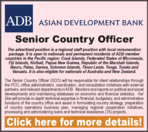 The advertised position is a regional staff position with local remuneration package. It is open to nationals and permanent residents of ADB member countries in the Pacific region: Cook Islands, Federated States of Micronesia, Fiji Islands, Kiribati, Papua New Guinea, Republic of the Marshall Islands, Nauru, Palau, Samoa, Solomon Islands, Timor-Leste, Tonga, Tuvalu and Vanuatu. It is also eligible for nationals of Australia and New Zealand.