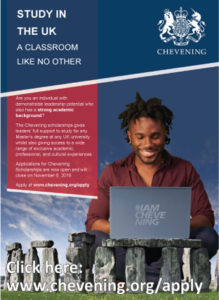 Applications for Chevening Scholarships are now open and will close on November 6, 2018.